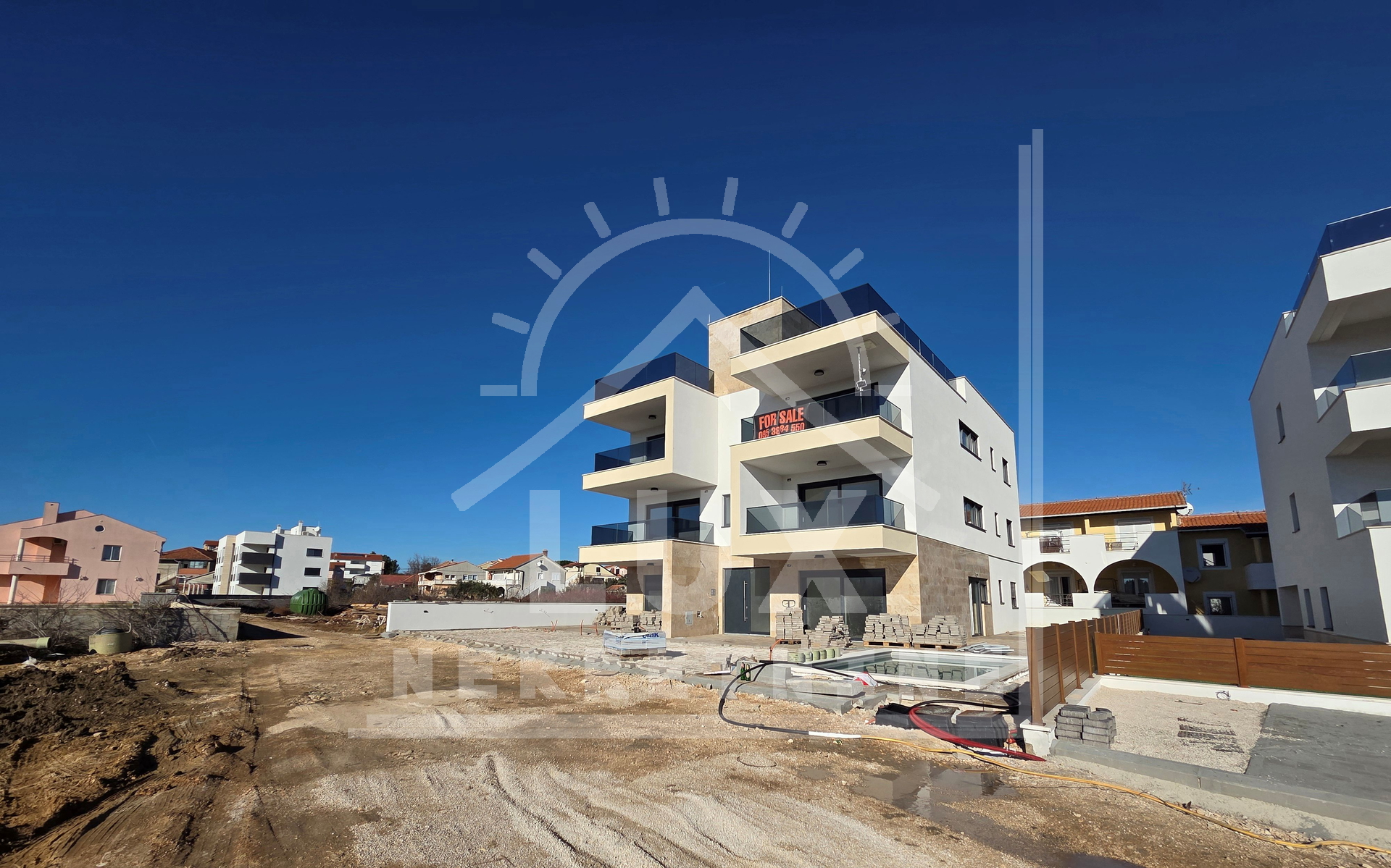 Die Gebäude befinden sich in der Endphase der Renovierung. Die Fertigstellung und der Einzug sind für Dezember 2025 geplant. Die Gebäude wurden mit hochwertigen Materialien der ersten Klasse errichtet und ausgestattet. Die Wohnungen verfügen über feuer- und einbruchsichere Eingangstüren, anthrazitfarbene PVC-Außenfenster und -türen, dreilagige Fenster mit elektrischen Rollläden und Insektenschutzgittern, Klimaanlage in allen Räumen (Wohnzimmer und Schlafzimmer), Fußbodenheizung in den Badezimmern, 10 cm dicke Wärmedämmfassade (voraussichtliche Energieeffizienzklasse A+), Video-Gegensprechanlage am Gebäudeeingang.