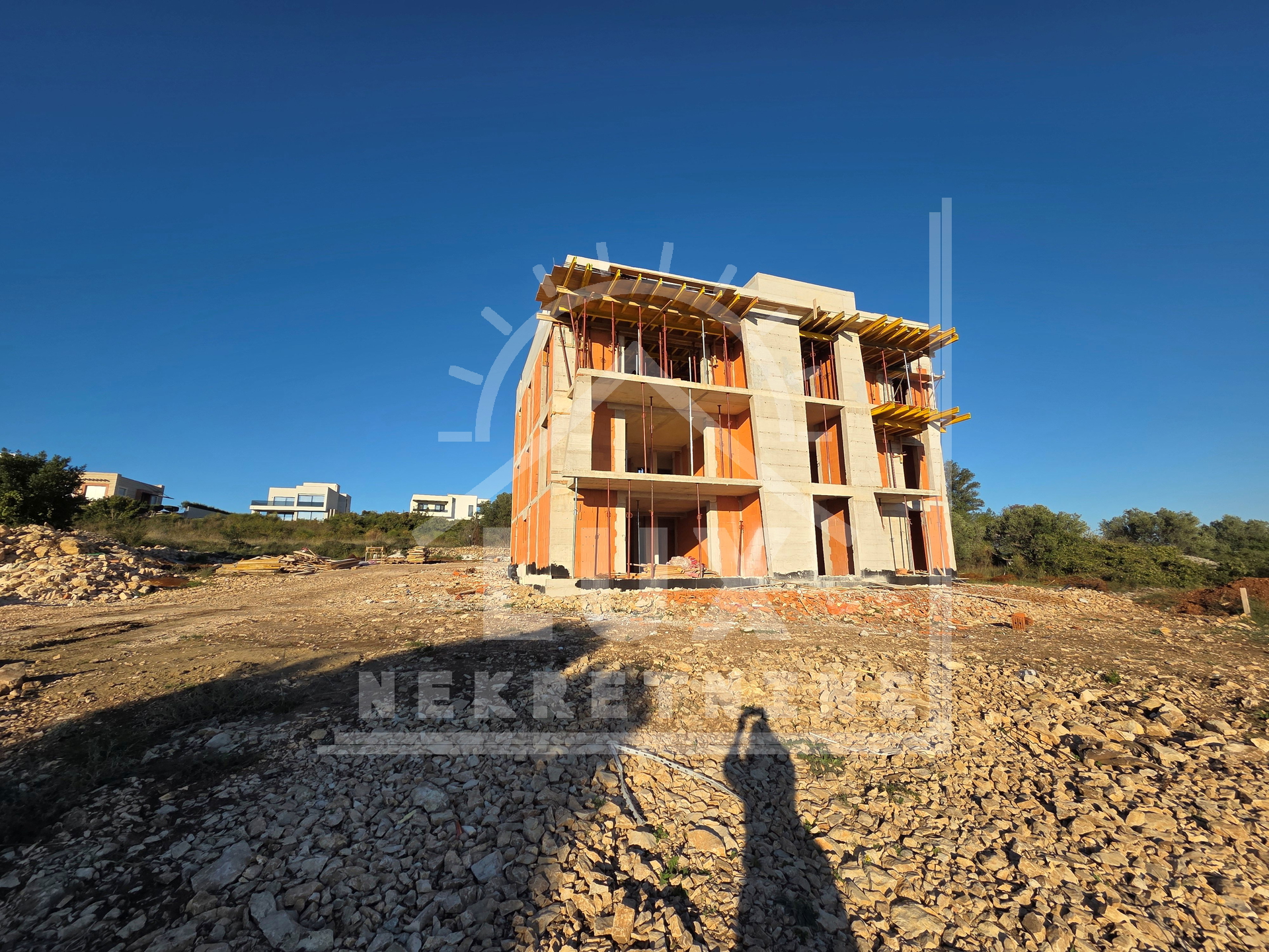 Ausstattung: Die Konstruktion besteht aus einer Kombination aus Ziegel-Thermoblock und Betonwänden, einer 10 cm dicken Styroporfassade (voraussichtliche Energieeffizienzklasse A); PVC-Außenfenster mit Dreifachglas, elektrischen Rollläden und Moskitonetzen; feuer- und einbruchsichere Eingangstüren; Fußbodenheizung in der gesamten Wohnung; hochwertige italienische Keramik auf den Böden; Klimaanlage in allen Zimmern und im Wohnzimmer; Kamin; Parkettboden kann in den Zimmern verlegt werden.