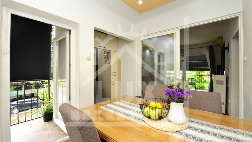 Die Wohnung befindet sich im 1. Stock und besteht aus: einem Flur mit Wendeltreppe in den 2. Stock, einem geräumigen Wohnzimmer, einem Esszimmer mit Küche, einem Schlafzimmer (mit Doppel-Boxspringbett und Kleiderschrank), einem Badezimmer (mit WC), einer Loggia (mit Grill) und einem Balkon (Südlage mit Meerblick). Im 2. Stock (Dachgeschoss) befinden sich ein Flur, zwei Schlafzimmer und zwei geschlossene Hauswirtschaftsräume, die durch Öffnen zu einem großen Raum werden.