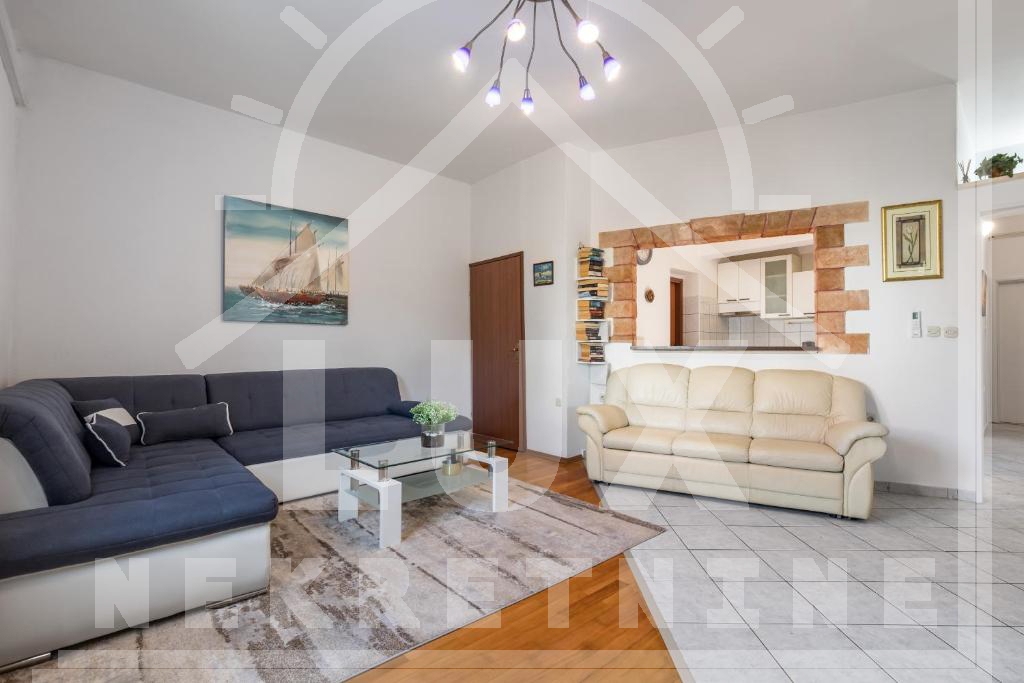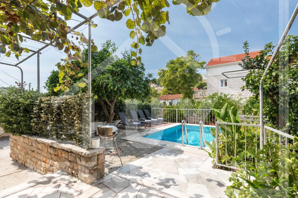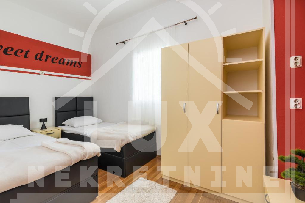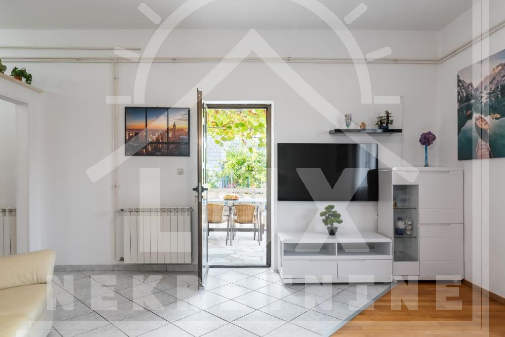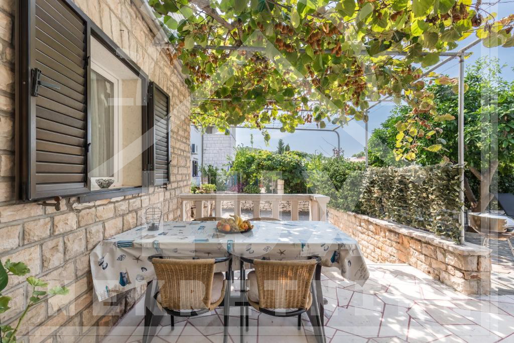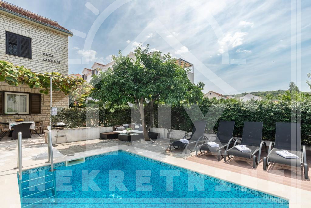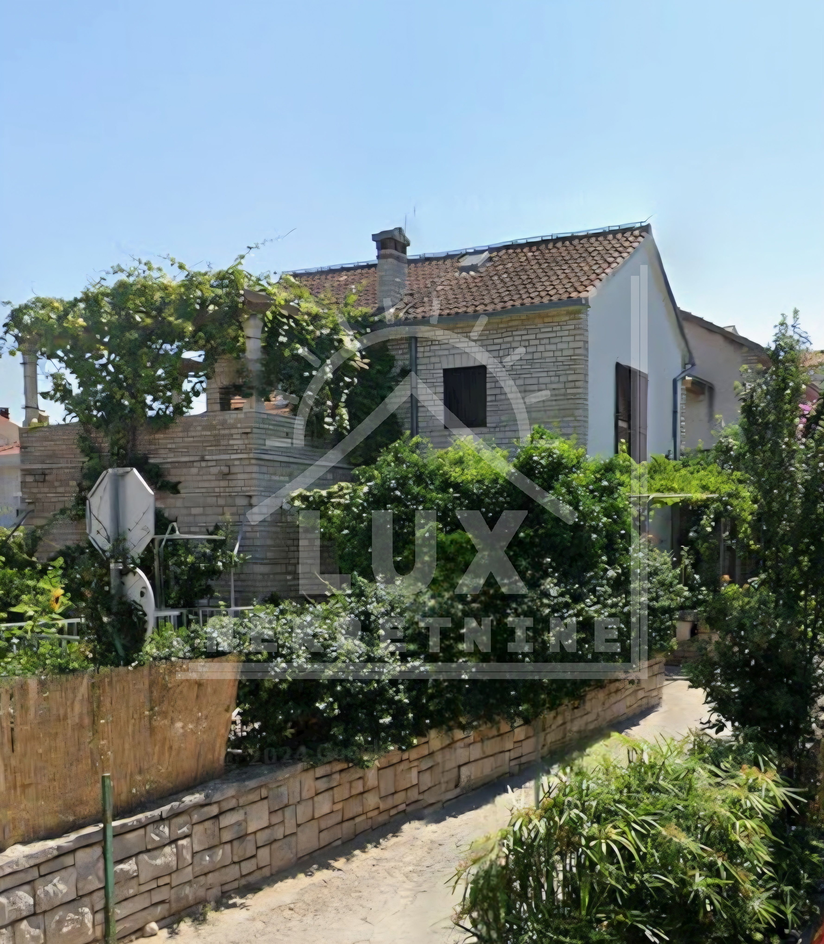 The house contains: a separate apartment on the ground floor with its own swimming pool (dimensions 2.50 x 4 m) and terrace, which is currently rented out as a tourist, a large apartment on the first floor with a spacious living room and balconies, an attic with the possibility of being converted into an additional residential unit, a plot of land with Mediterranean fruit trees and a high degree of privacy, a garage with two parking spaces, a tavern and a storage room.