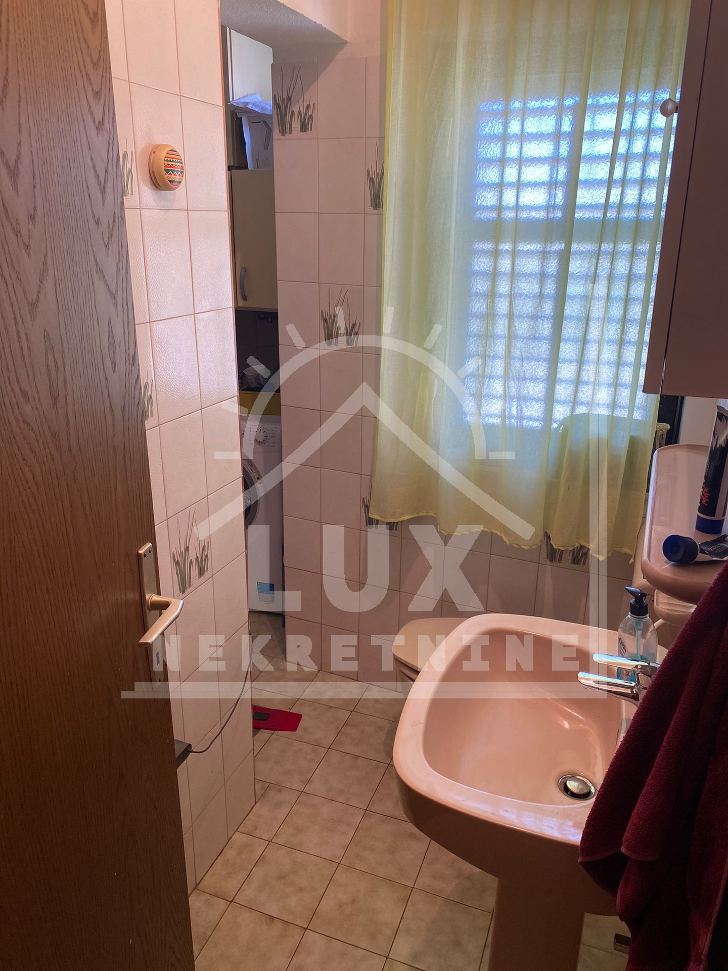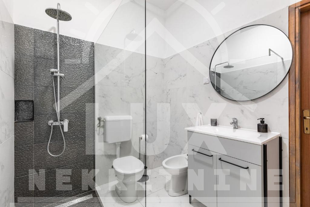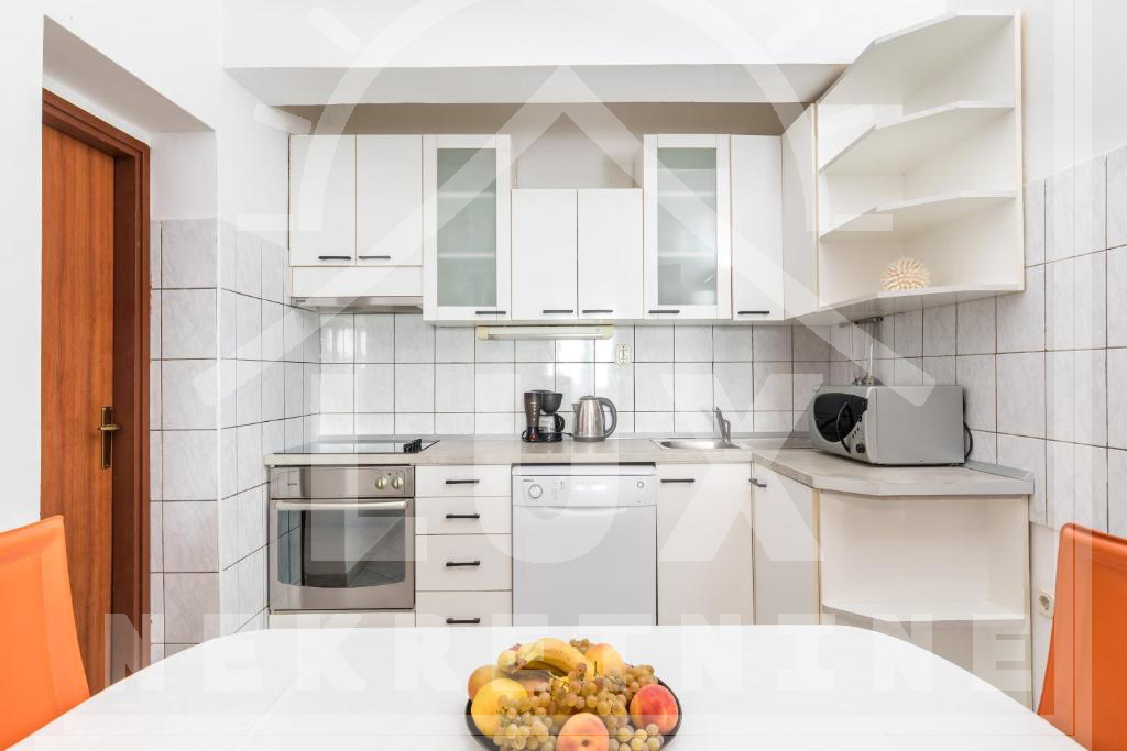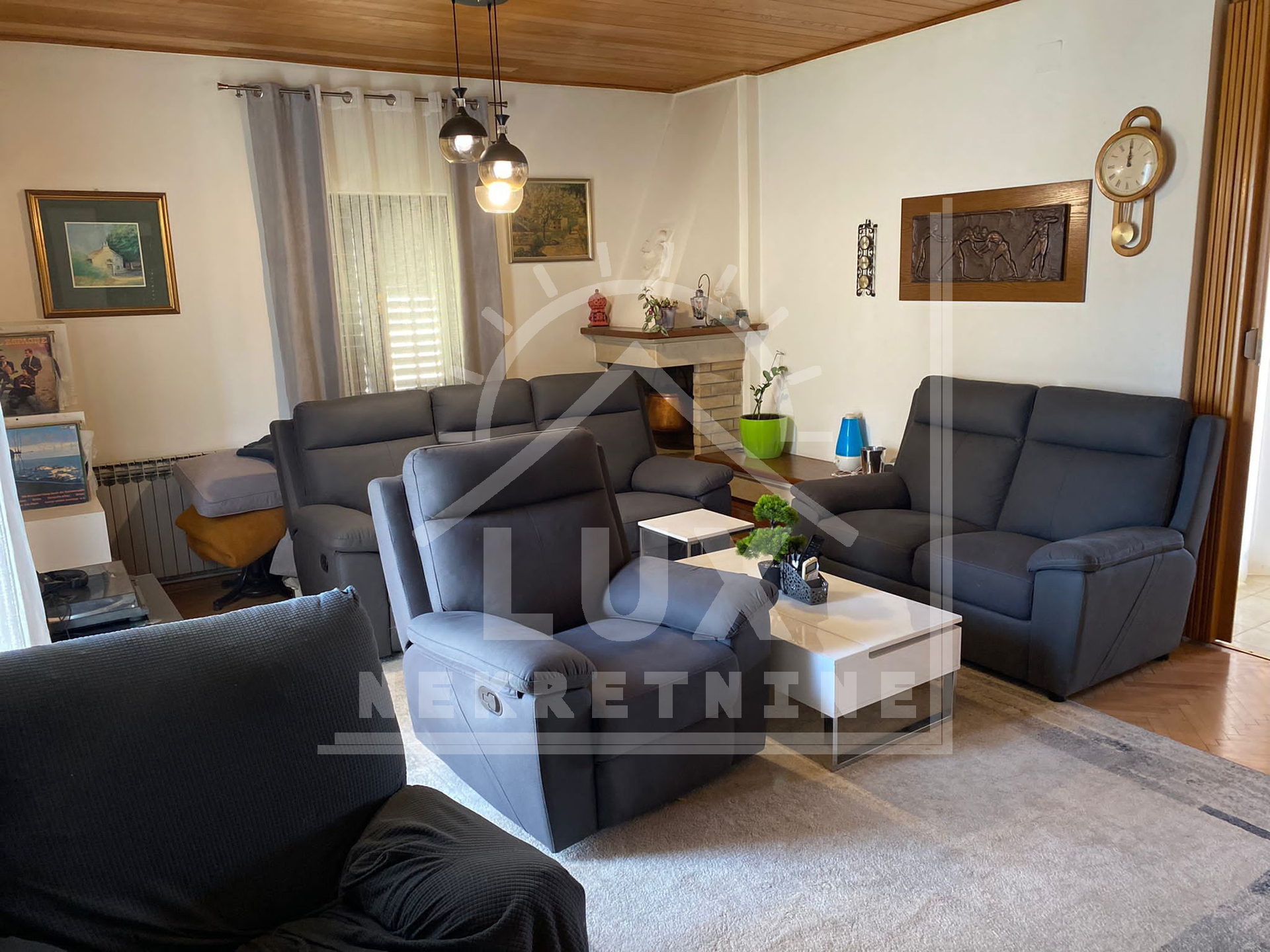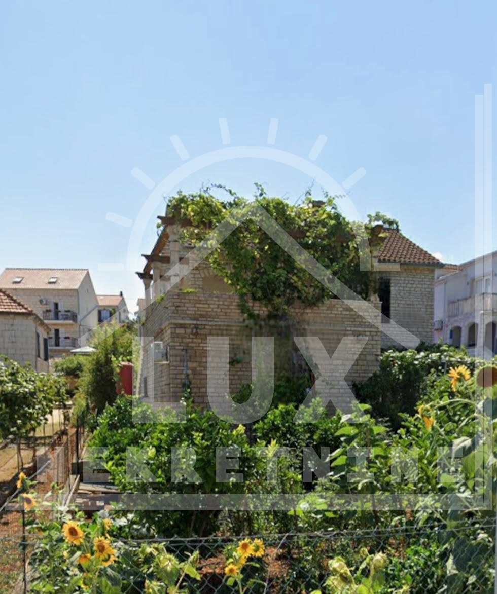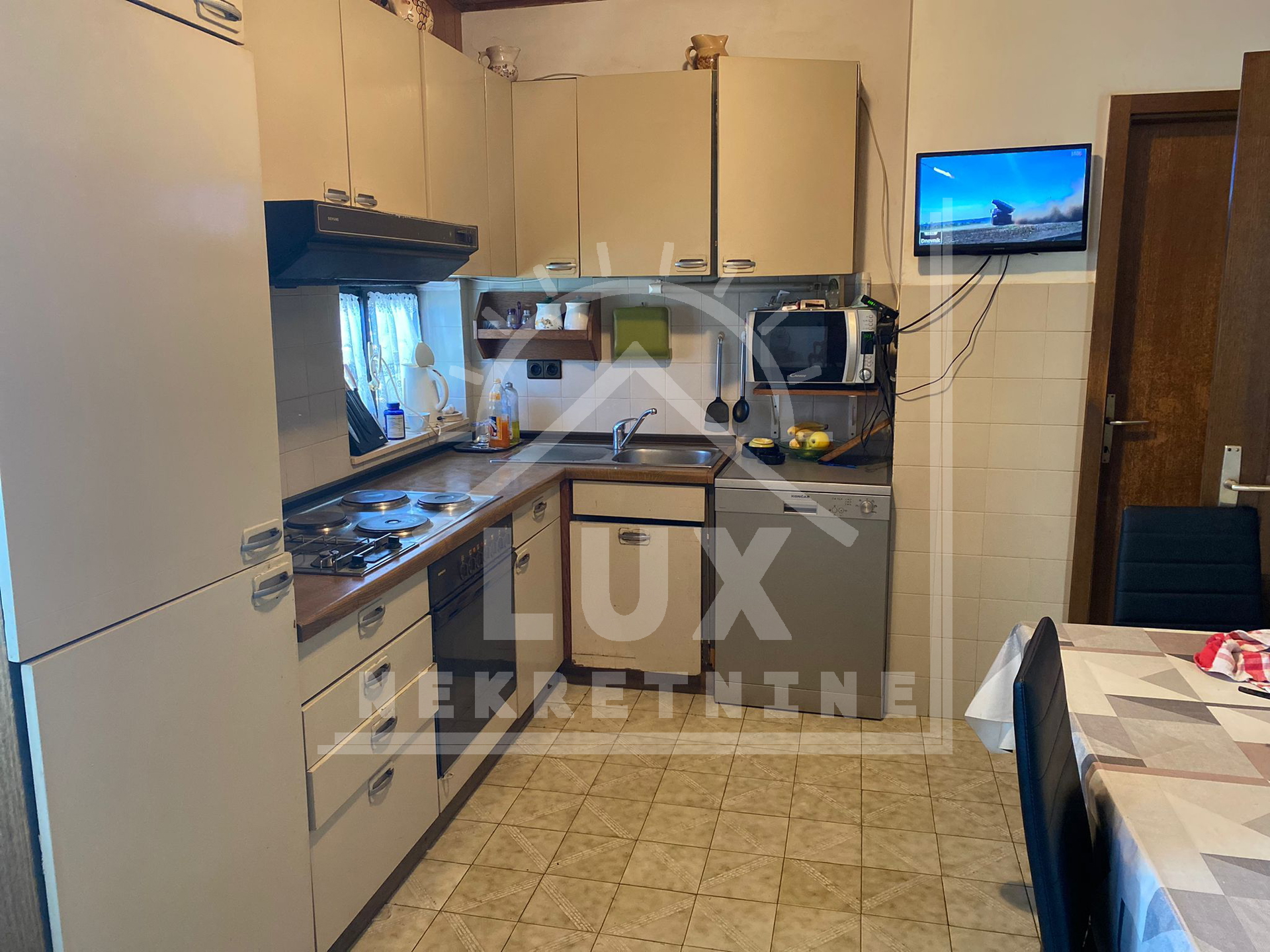The house contains: a separate apartment on the ground floor with its own swimming pool (dimensions 2.50 x 4 m) and terrace, which is currently rented out as a tourist, a large apartment on the first floor with a spacious living room and balconies, an attic with the possibility of being converted into an additional residential unit, a plot of land with Mediterranean fruit trees and a high degree of privacy, a garage with two parking spaces, a tavern and a storage room.