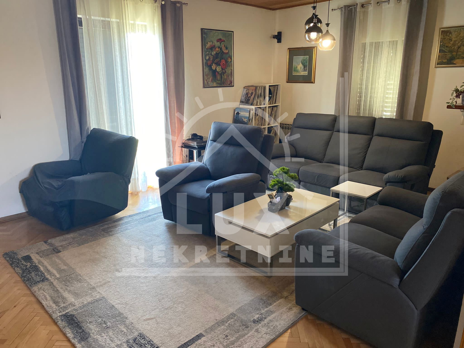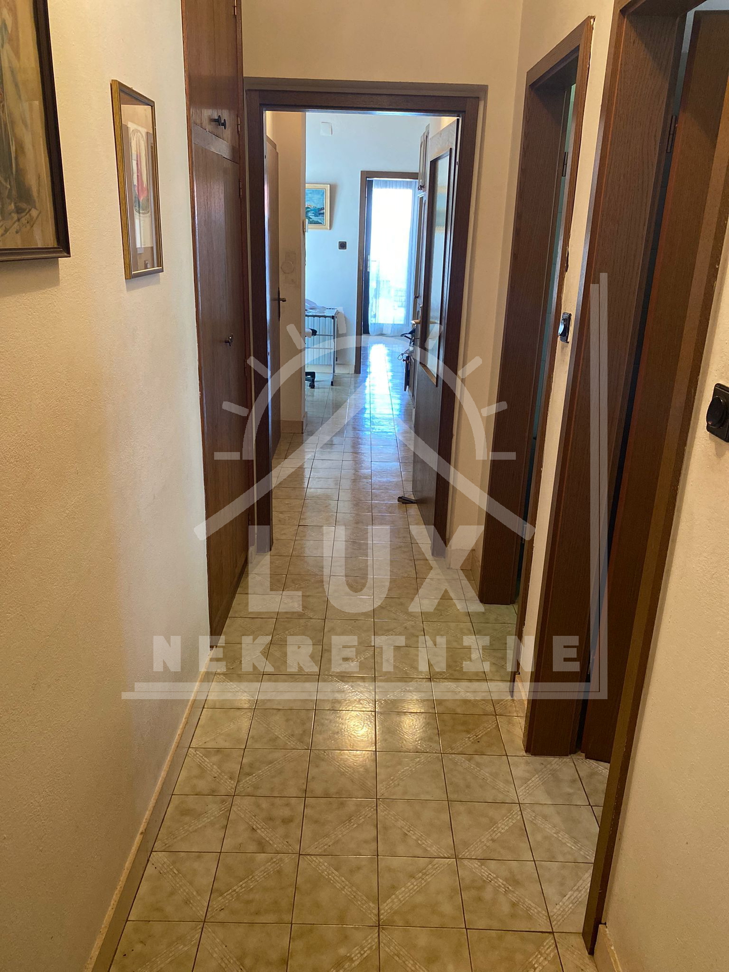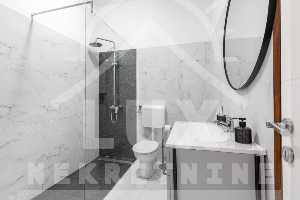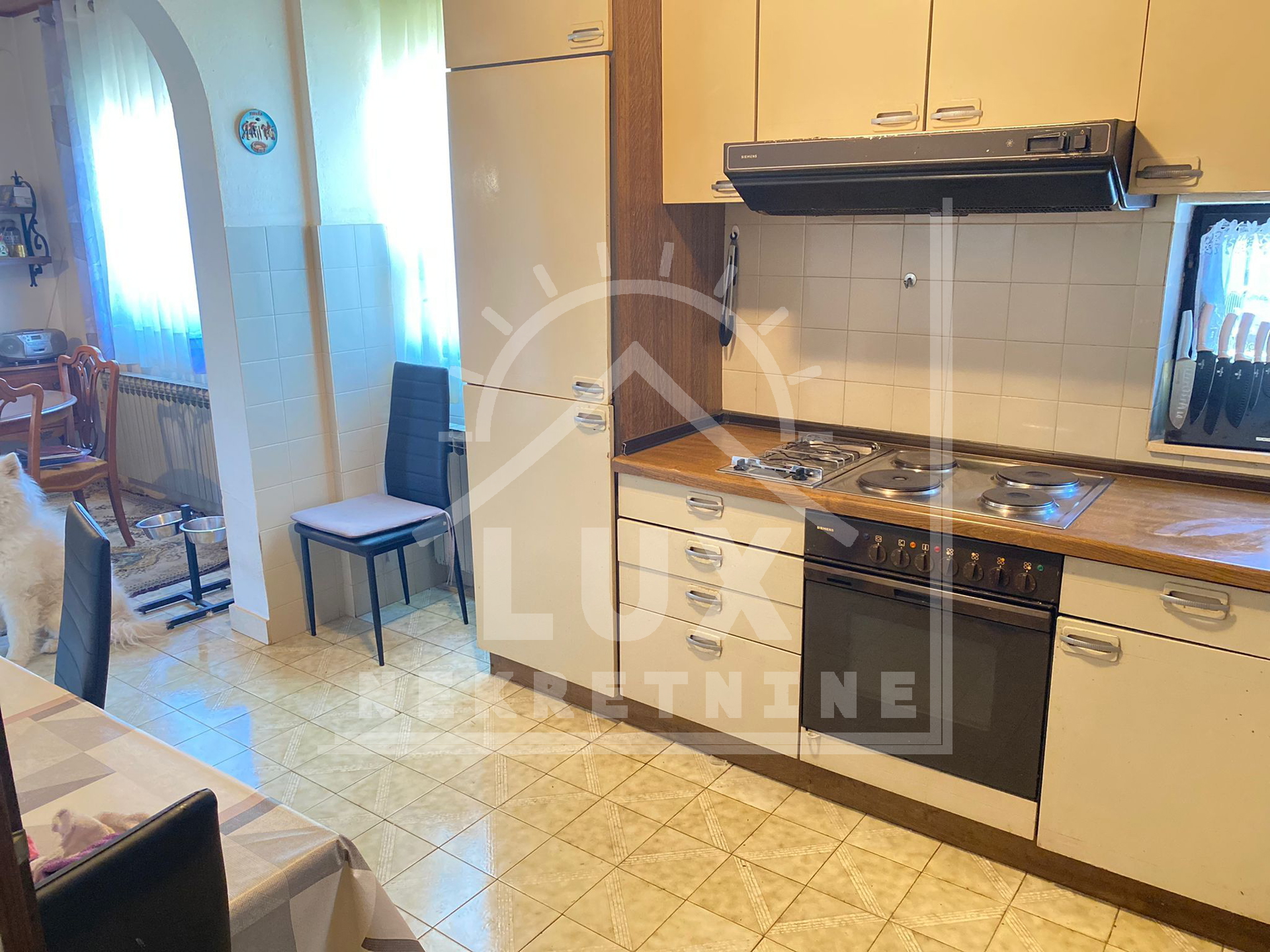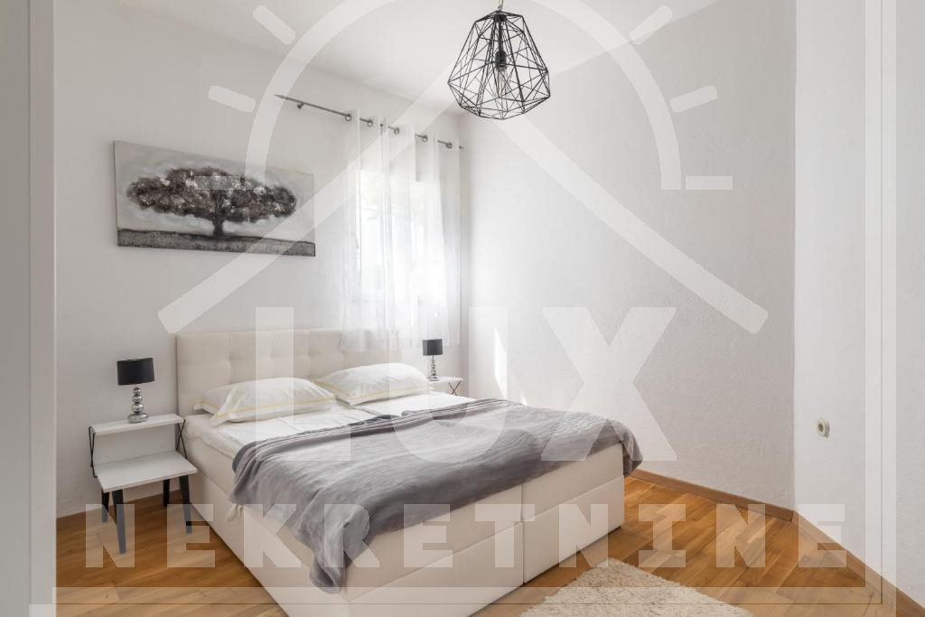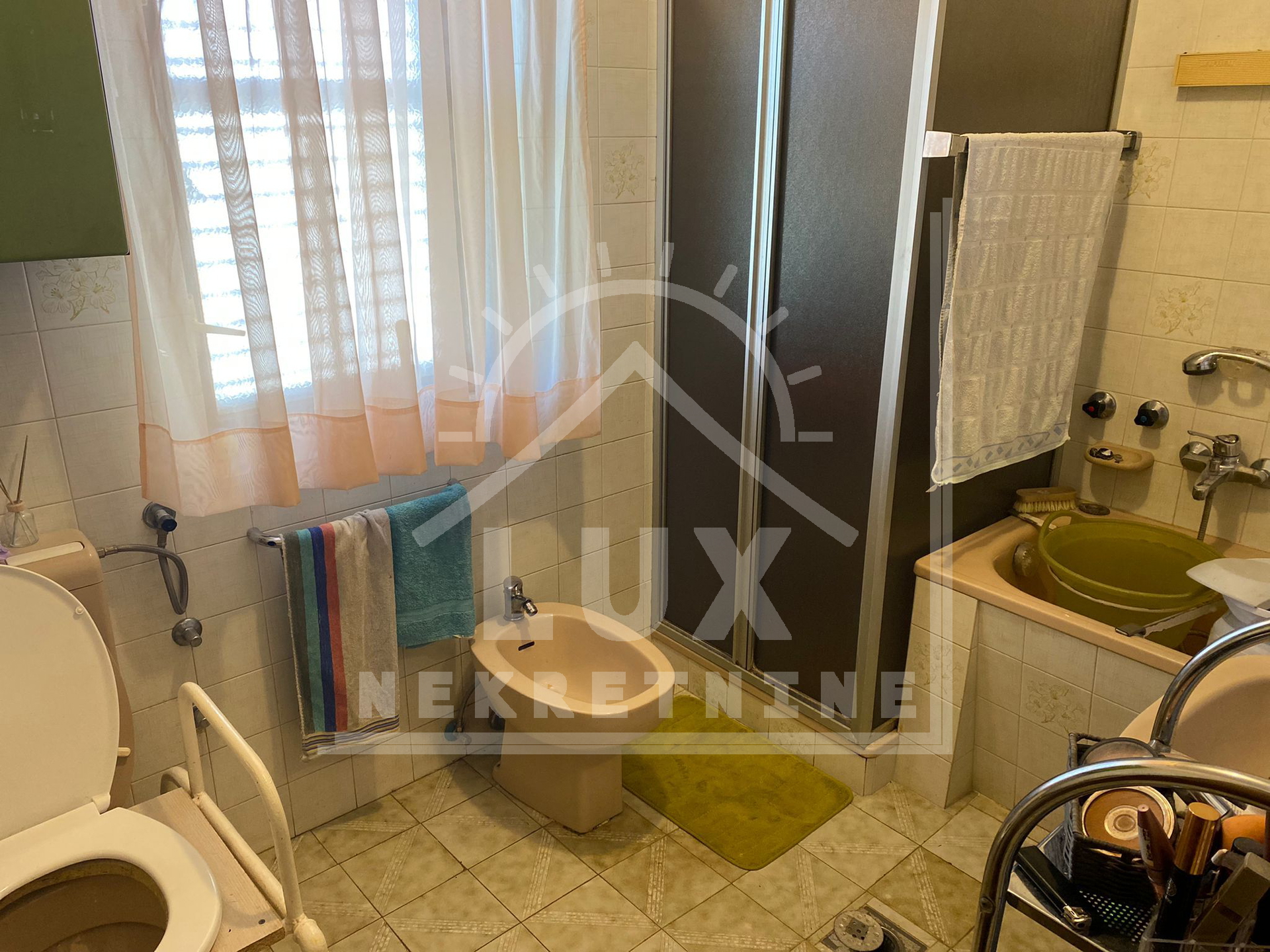 The house contains: a separate apartment on the ground floor with its own swimming pool (dimensions 2.50 x 4 m) and terrace, which is currently rented out as a tourist, a large apartment on the first floor with a spacious living room and balconies, an attic with the possibility of being converted into an additional residential unit, a plot of land with Mediterranean fruit trees and a high degree of privacy, a garage with two parking spaces, a tavern and a storage room.