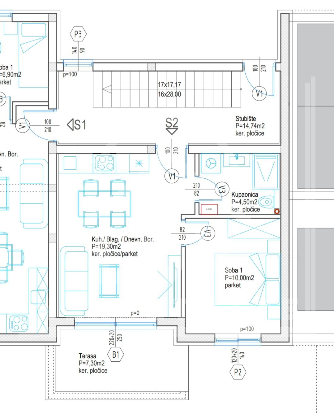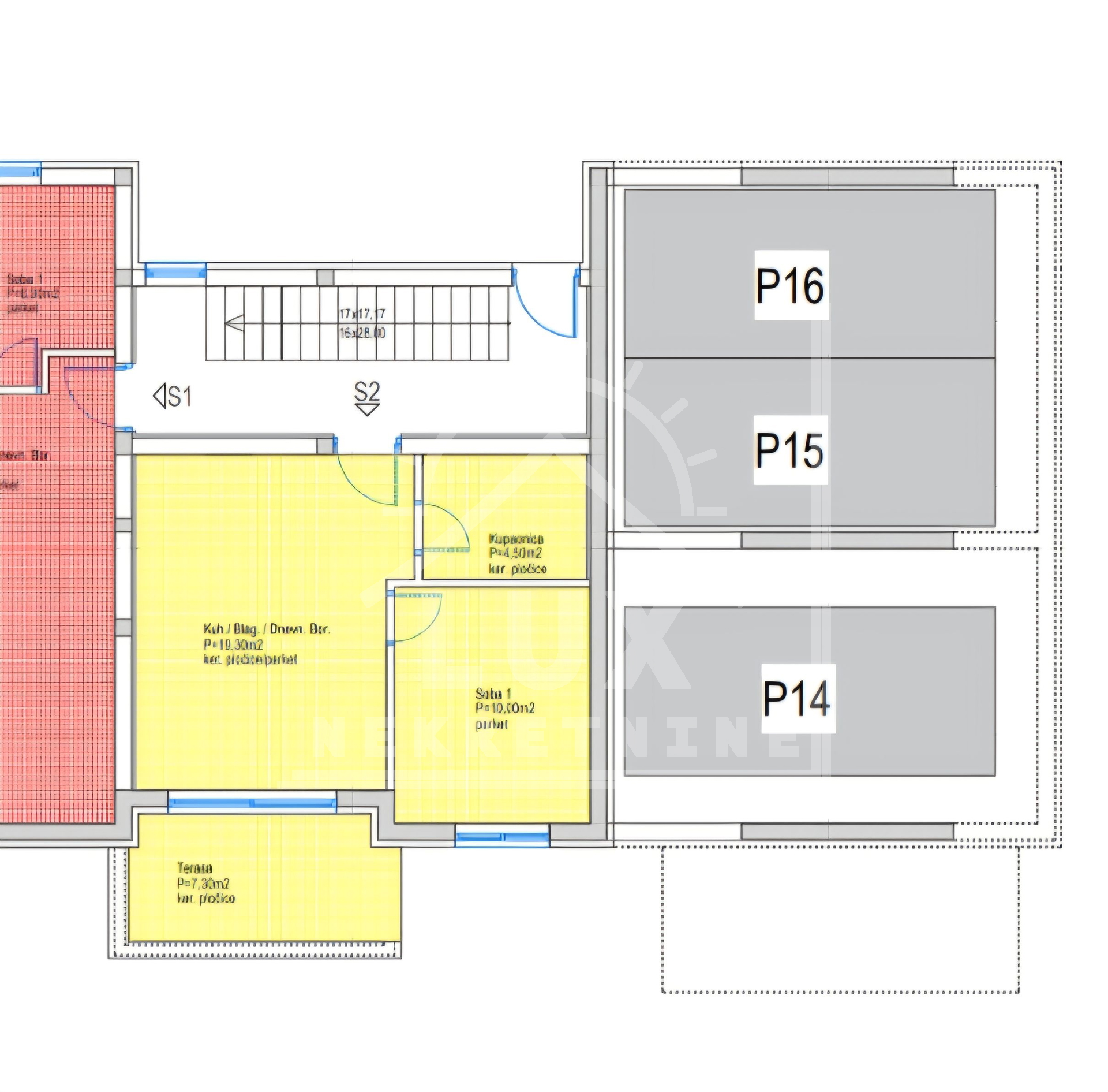 APARTMENT S2 on the ground floor with a garden, one bedroom, area 47.95 m2, contains: living room with dining room and kitchen (area 19.30 m2), bedroom (area 10 m2), bathroom (area 4.50 m2) and terrace (area 7.30 m2).