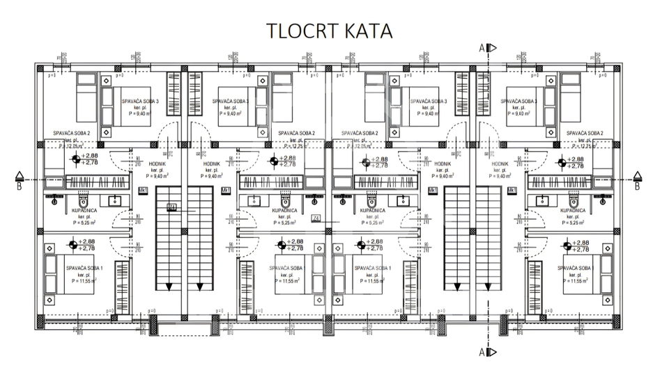 KUĆA S2 u prizemlju sadrži: dnevni boravak s blagovaonicom i kuhinjom (pov. 37.95 m2), natkriveni ulaz, hodnik (pov. 4.80 m2), kupaonicu (pov. 4.05 m2), strojarnicu/vešeraj (pov. 4.20 m2) i stubište. Kat sadrži: hodnik (pov. 9.40 m2), tri spavaće sobe (pov. 12.75 m2, 11.55 m2 i 9.40 m2) i kupaonicu (pov. 5.25 m2).
