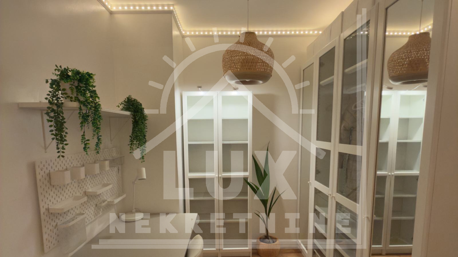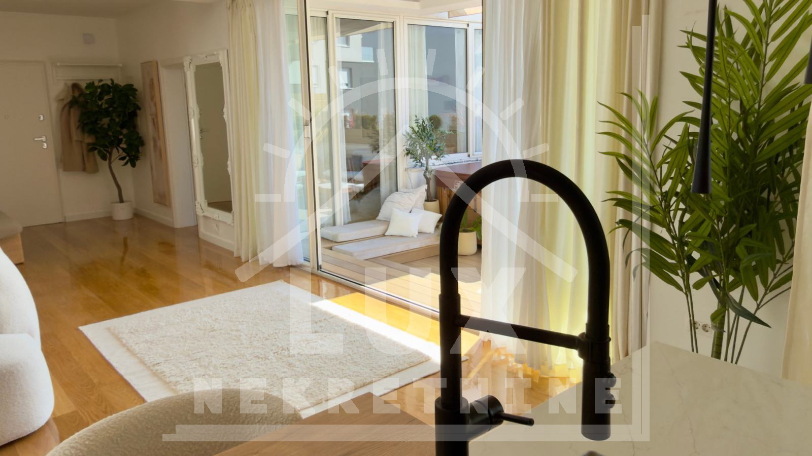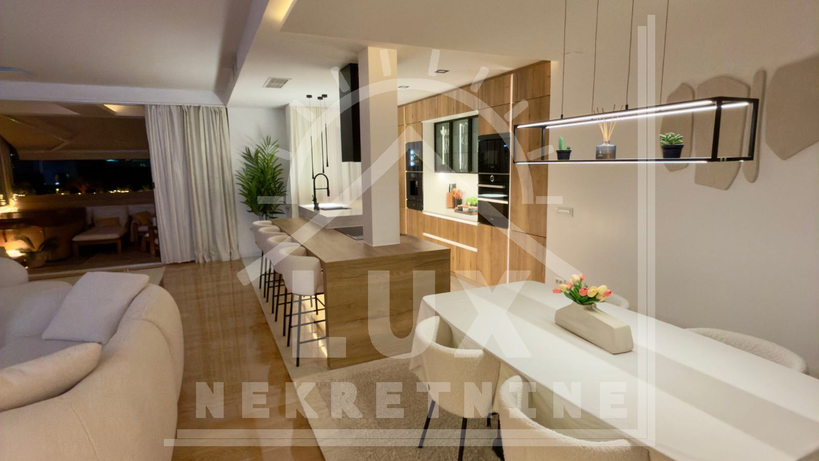 Sastoji se od dva hodnika, prostranog dnevnog boravka s blagovaonicom i kuhinjom OPEN SPACE koncepta, tri spavaće sobe, dvije kupaonice, WC-a, ostave i natkrivene terase na kojoj je smješten jacuzzi i ugrađeni roštilj/grill. Stan je uređen iznimno stilski i luksuzno. Takav se i prodaje. Glavna spavaća soba ima svoju kupaonicu. Kompletna oprema stana (namještaj, rasvjeta, aparati) su iznimno luksuzni i skupi (npr. 5 klima uređaja, Nolte kuhinja, dnevni boravak s kominom, tri Sony Smart TV-a, walk-in garderoba itd.).