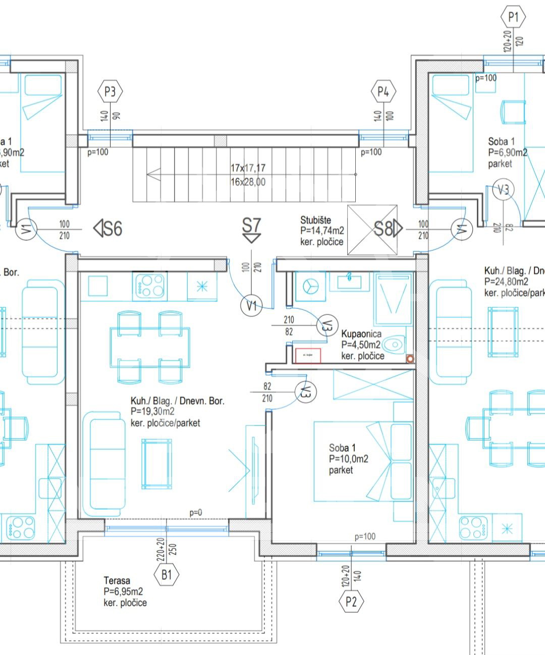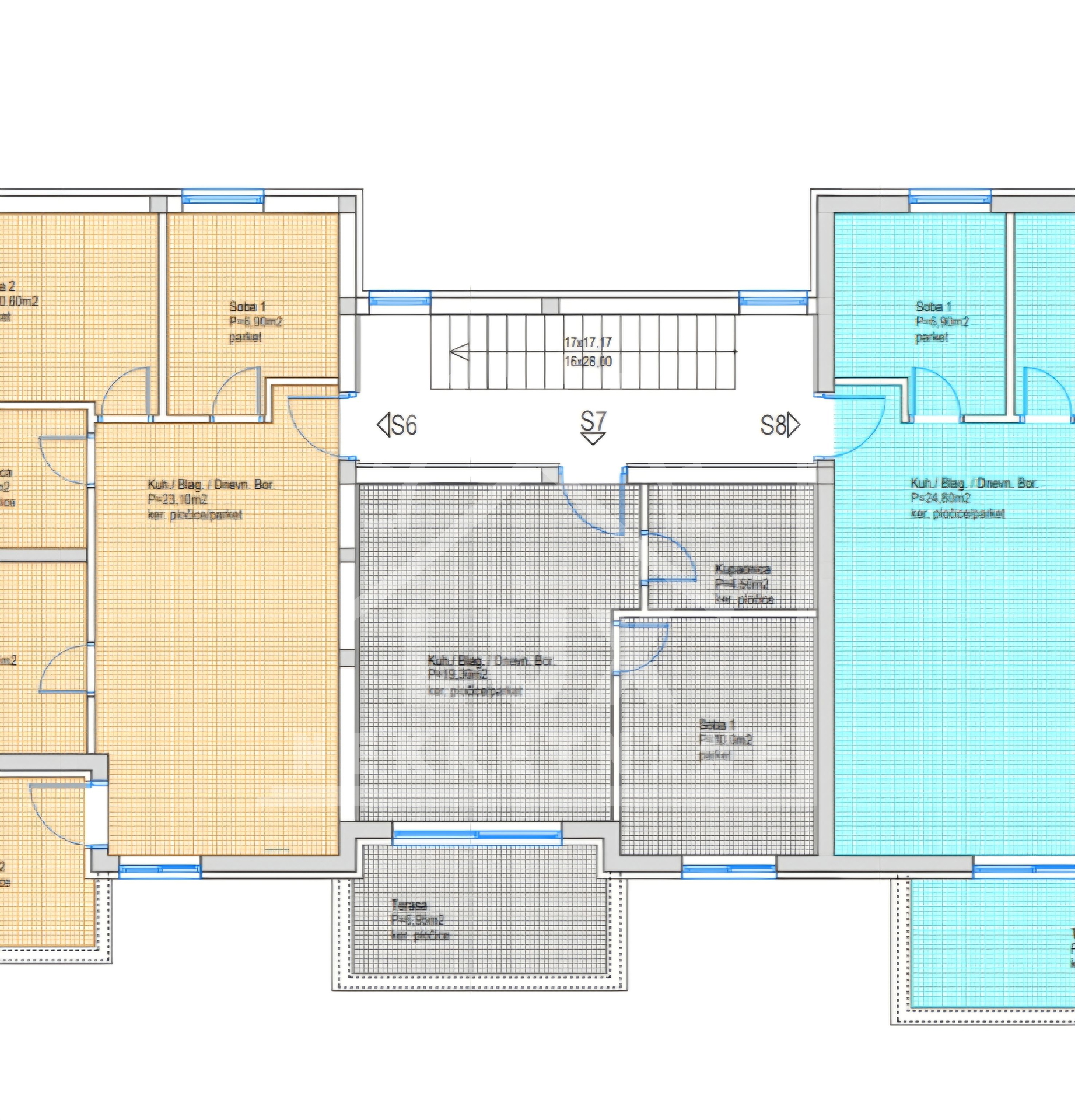 STAN S7 na 2. katu, jednosoban, sadrži: : dnevnog boravka s blagovaonicom i kuhinjom (pov. 19.30 m2), spavaću sobu (pov. 10 m2), kupaonicu (pov. 4.50 m2) i terasu (pov. 6.90 m2).