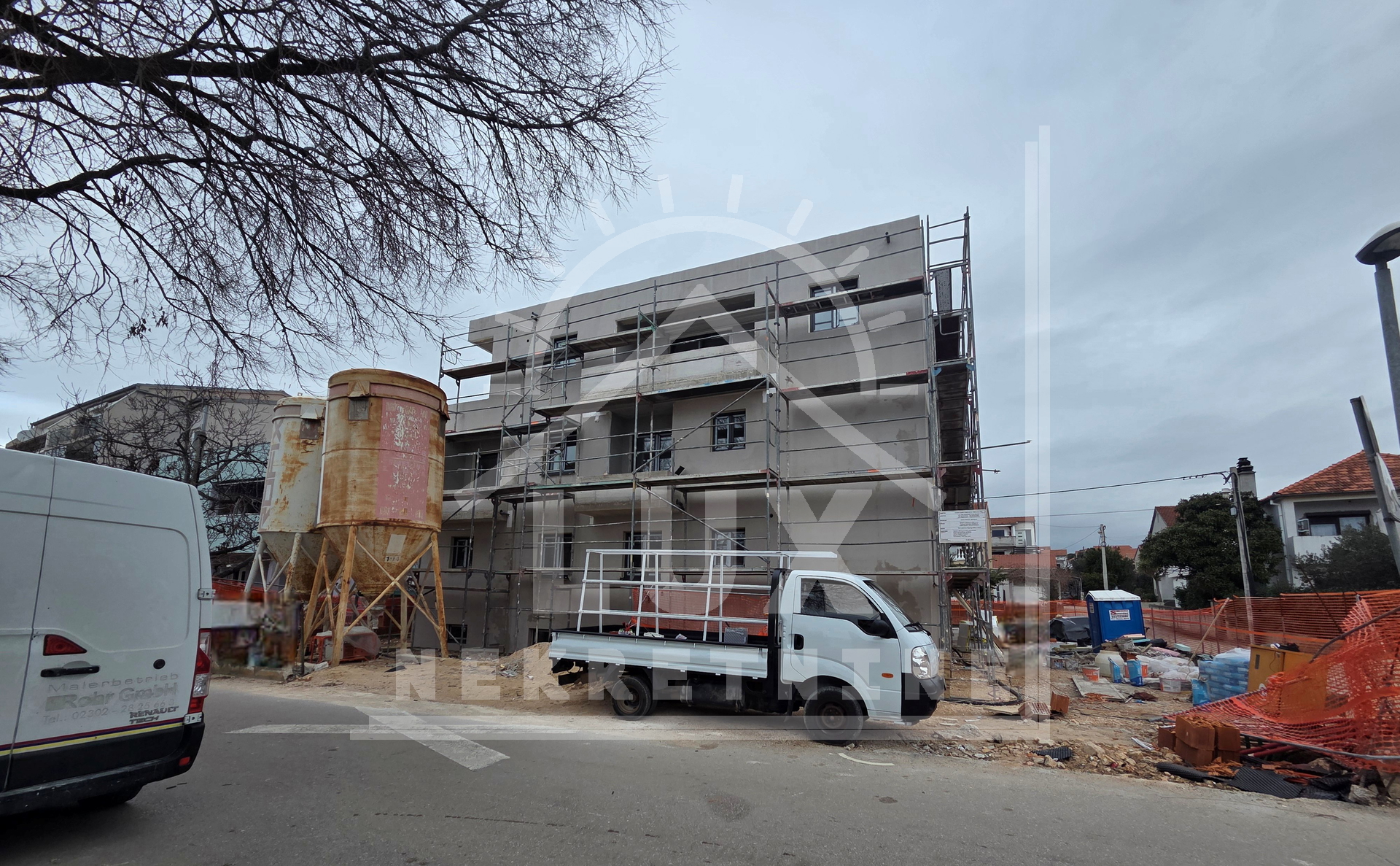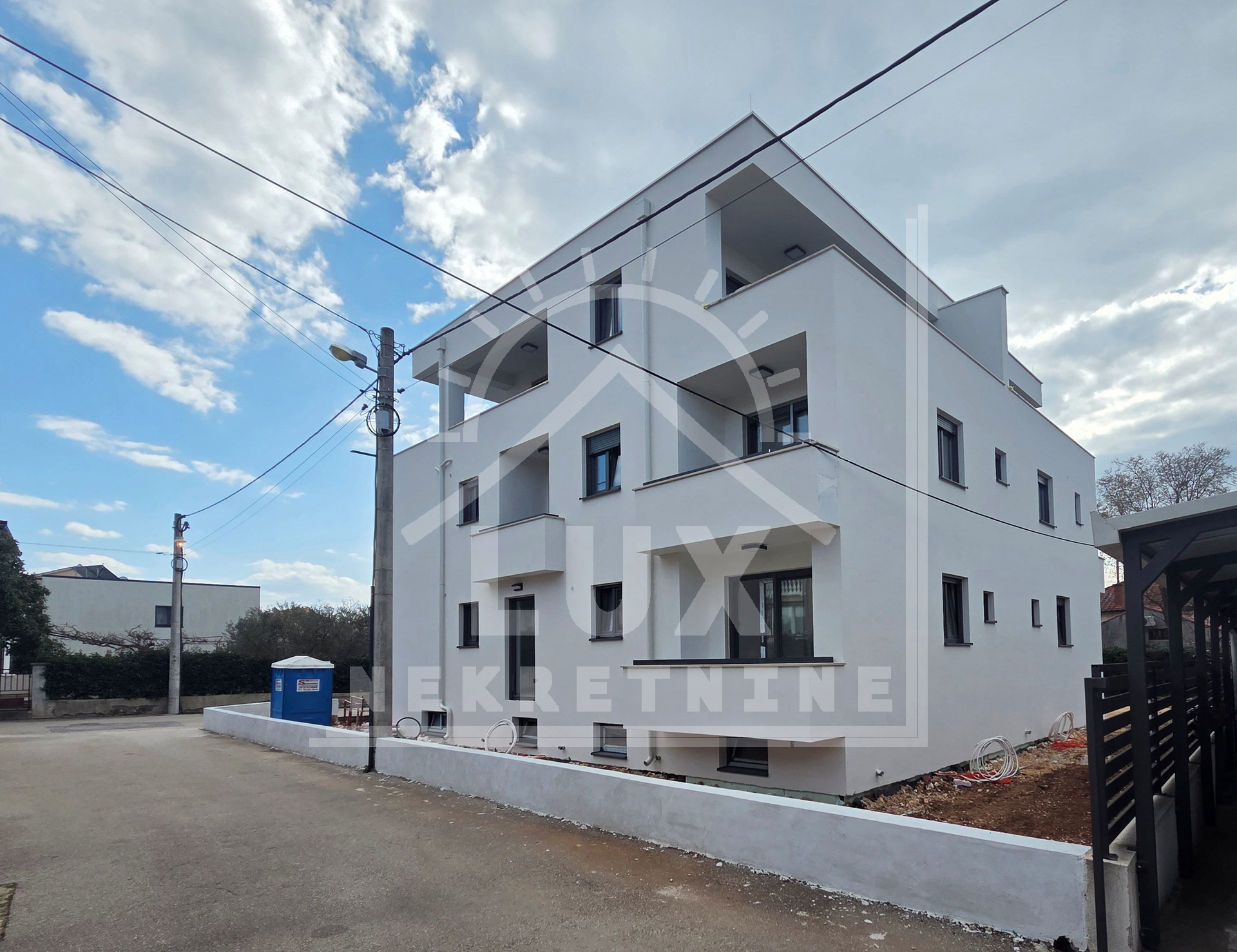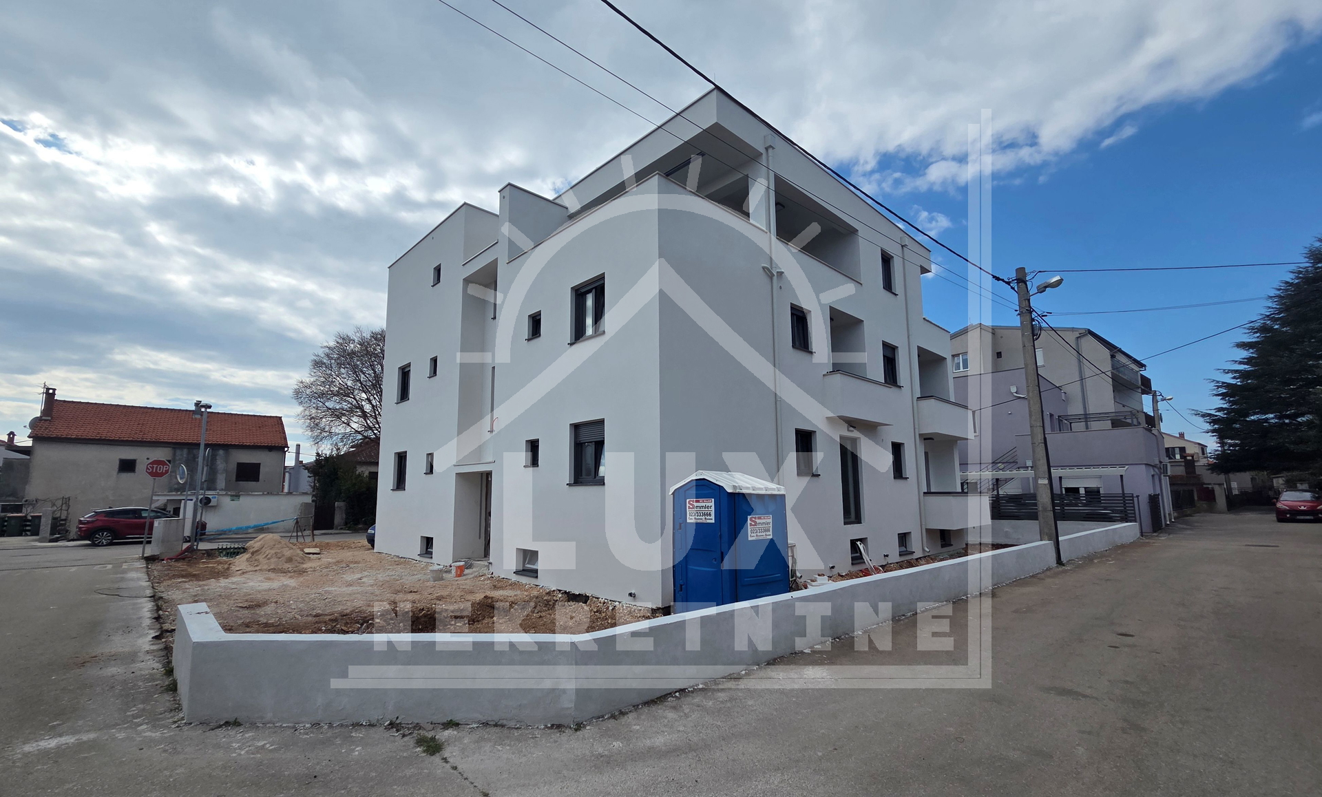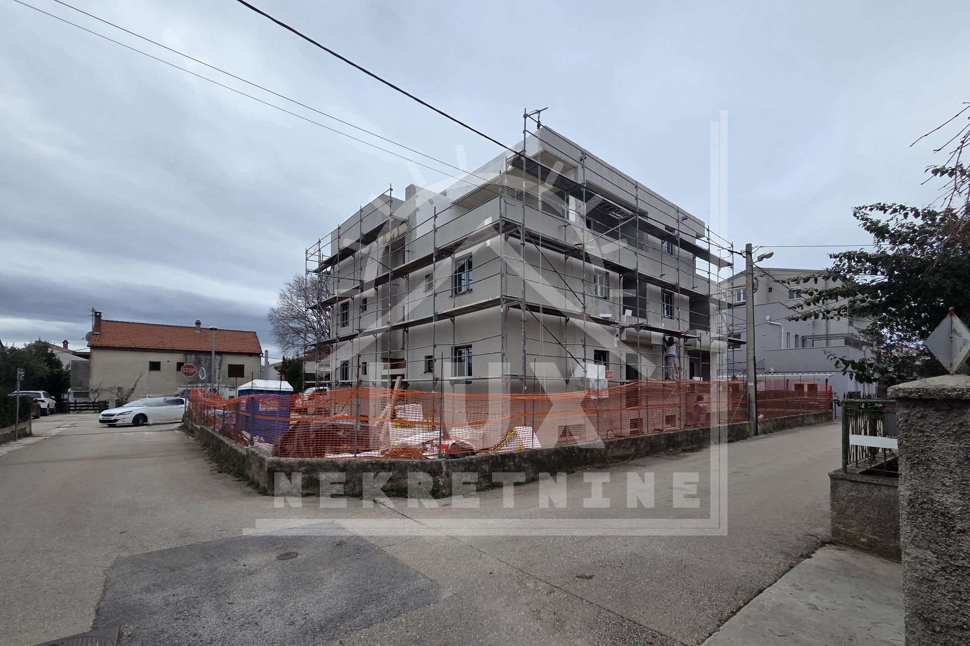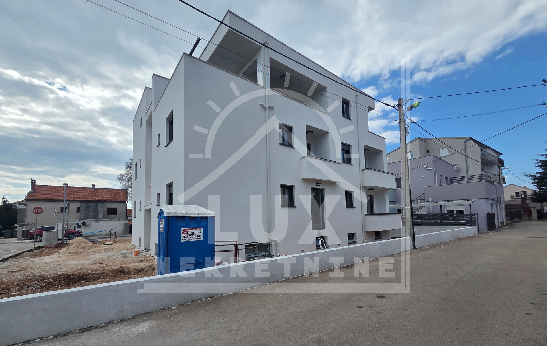 Manjša stanovanjska stavba z 9 stanovanjskimi enotami, Zadar (Borik) NOVOGRADNJA. Sestavljena je iz kleti, pritličja in dveh nadstropij. Stavba je zgrajena iz najkakovostnejših materialov (10 cm debela fasada - pričakovani energijski razred A+, protivlomna in protipožarna vhodna vrata v stanovanja, PVC zunanje stavbno pohištvo z mrežami proti komarjem in električnimi roletami, električno talno ogrevanje po celotnem stanovanju, kopalne kadi v kopalnicah, steklene ograje na balkonih, video domofon pri vhodu v stavbo). Kupec lahko izbere keramična ali parketna tla. Vsako stanovanje ima svojo shrambo v kleti stavbe in eno zunanje parkirno mesto. Stavba bo priključena na mestni kanalizacijski sistem.