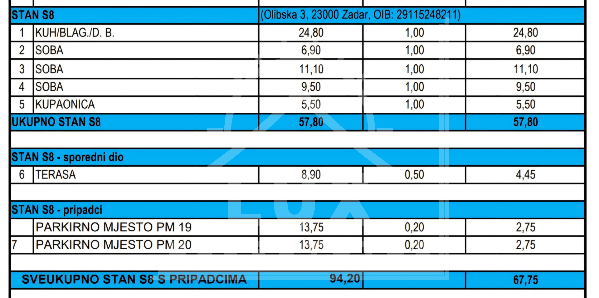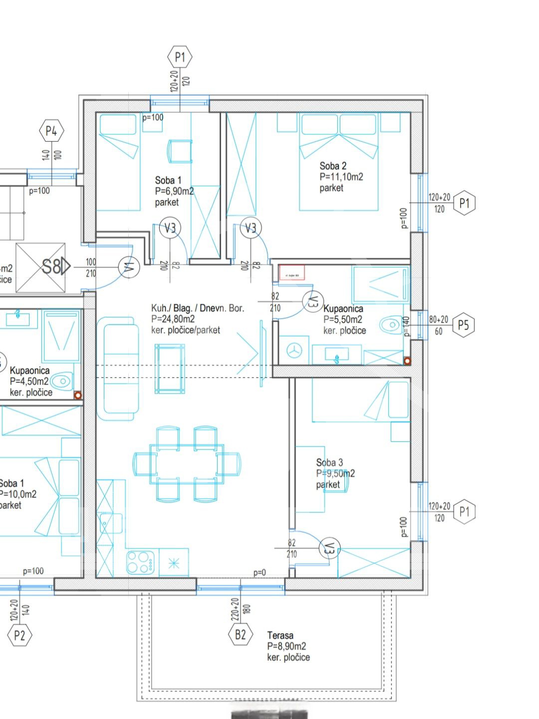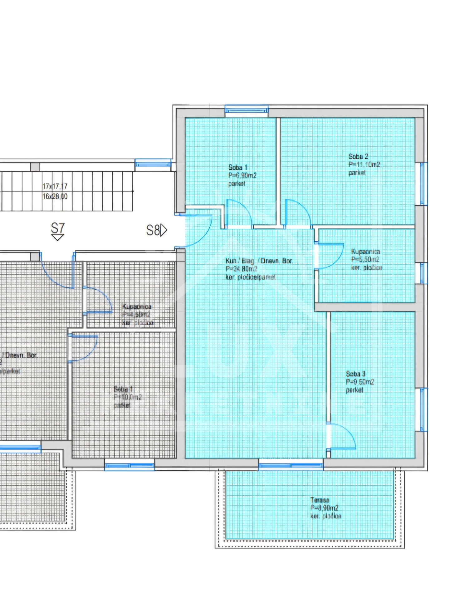 STANOVANJE S8 v 2. nadstropju, trisobno, vsebuje: dnevno sobo z jedilnico in kuhinjo (površina 24,80 m2), tri spalnice (površina 11,10 m2, 9,50 m2 in 6,90 m2), kopalnico (površina 5,50 m2) in teraso (površina 8,90 m2).